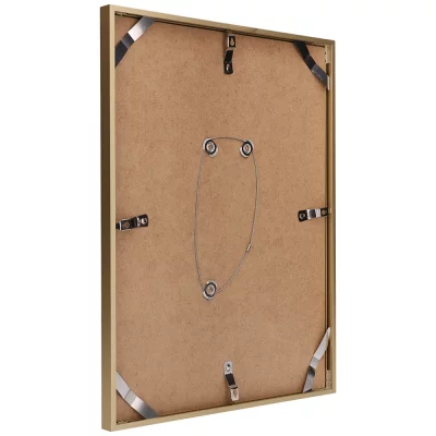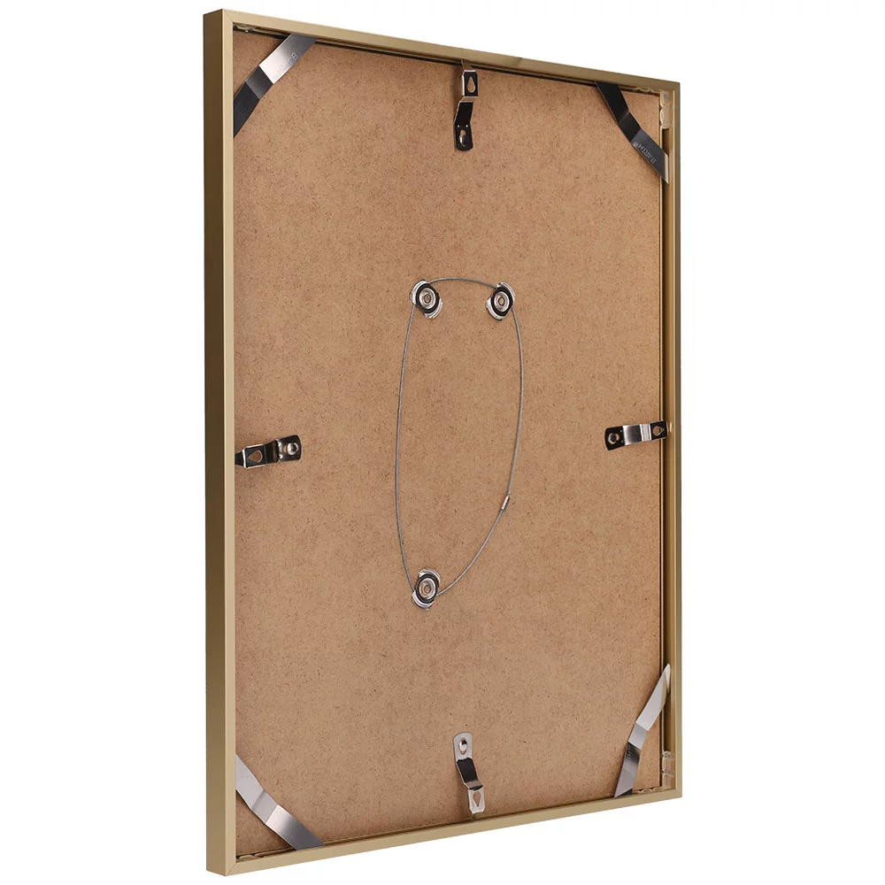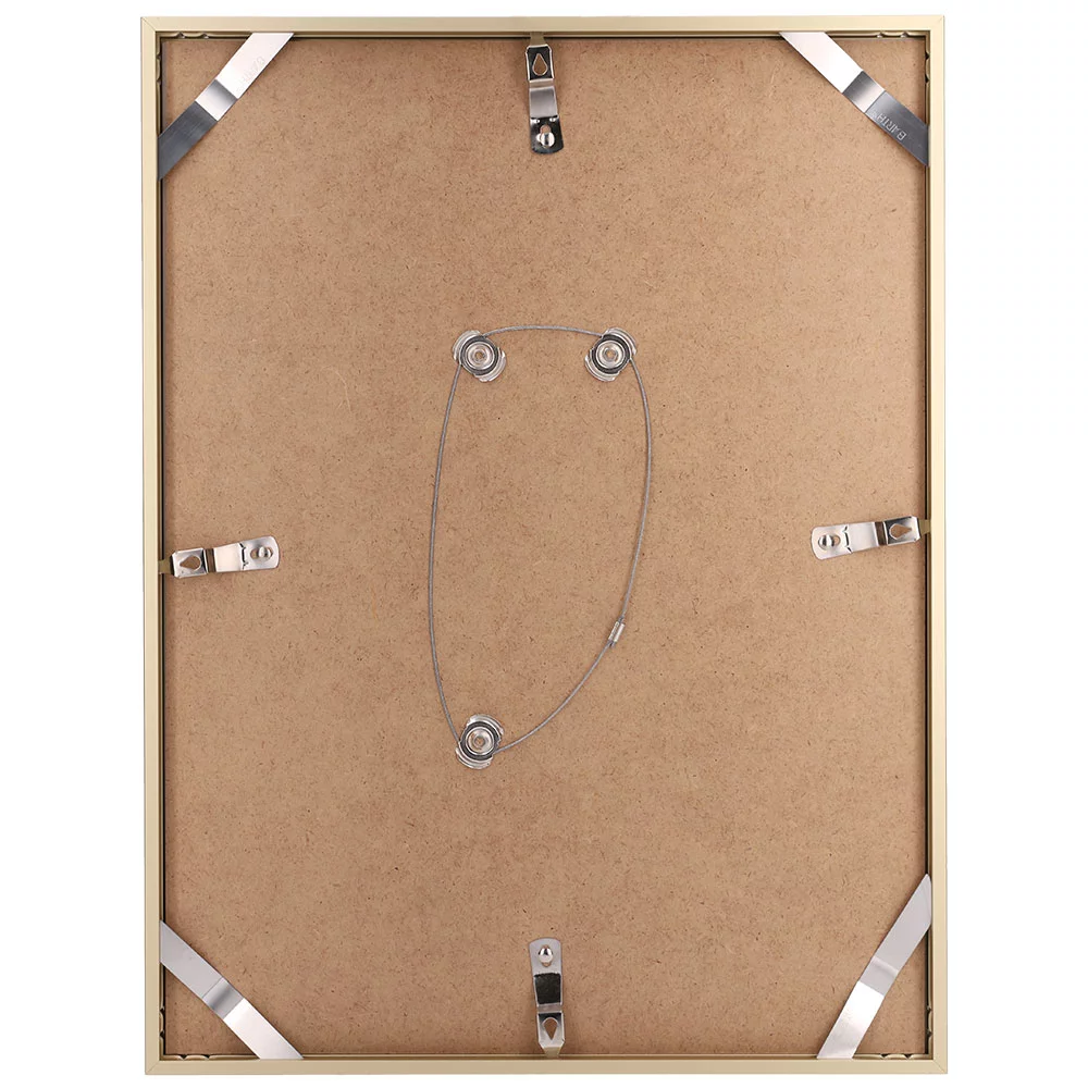 Die Rückwand des Bilderrahmens besteht aus einer 3 mm dicken, robusten Platte aus HDF-Holz. Dank der bequemen Schwenkfedern und Eckklammern werden Rückwand und Rahmen zuverlässig und sicher zusammengehalten. Selbst bei regelmäßigem Bildwechsel entstehen kaum Verschleißspuren. Die Handhabung ist einfach und schnell. Eine Drahtkonstruktion mit drei Fixpunkten ab dem Format DIN A3/30 x 40 cm dient als zusätzliche Aufhängungsmöglichkeit zu den Schwenkfedern.