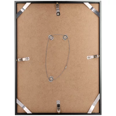 Die Rückwand des Bilderrahmens besteht aus einer 3 mm dicken, robusten Platte aus HDF-Holz. Dank der bequemen Schwenkfedern und Eckklammern werden Rückwand und Rahmen zuverlässig und sicher zusammengehalten. Selbst bei regelmäßigem Bildwechsel entstehen kaum Verschleißspuren. Die Handhabung ist einfach und schnell. Eine Drahtkonstruktion mit drei Fixpunkten ab dem Format DIN A3/30 x 40 cm dient als zusätzliche Aufhängungsmöglichkeit zu den Schwenkfedern.