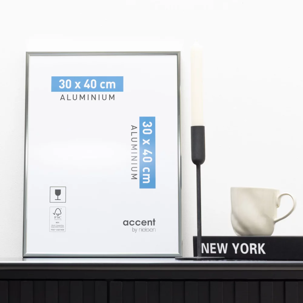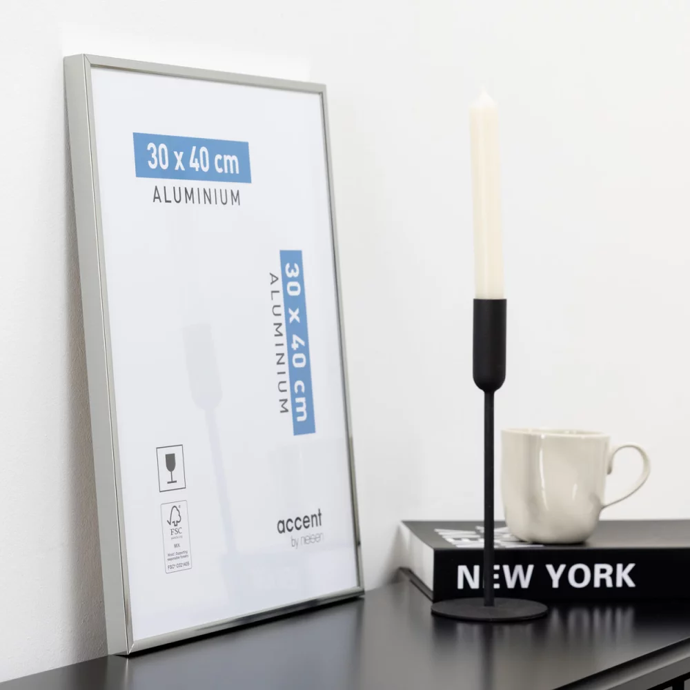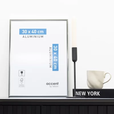 - Der Bilderrahmen Accent besitzt ein schmales 7,8 mm-Aluminiumprofil, dessen Innenkante geschrägt und Außenkante gerundet ist. Die puristische Form und die metallglänzenden Farben verleihen Ihrem Bild mehr Glanz und stehen für modernes Design.