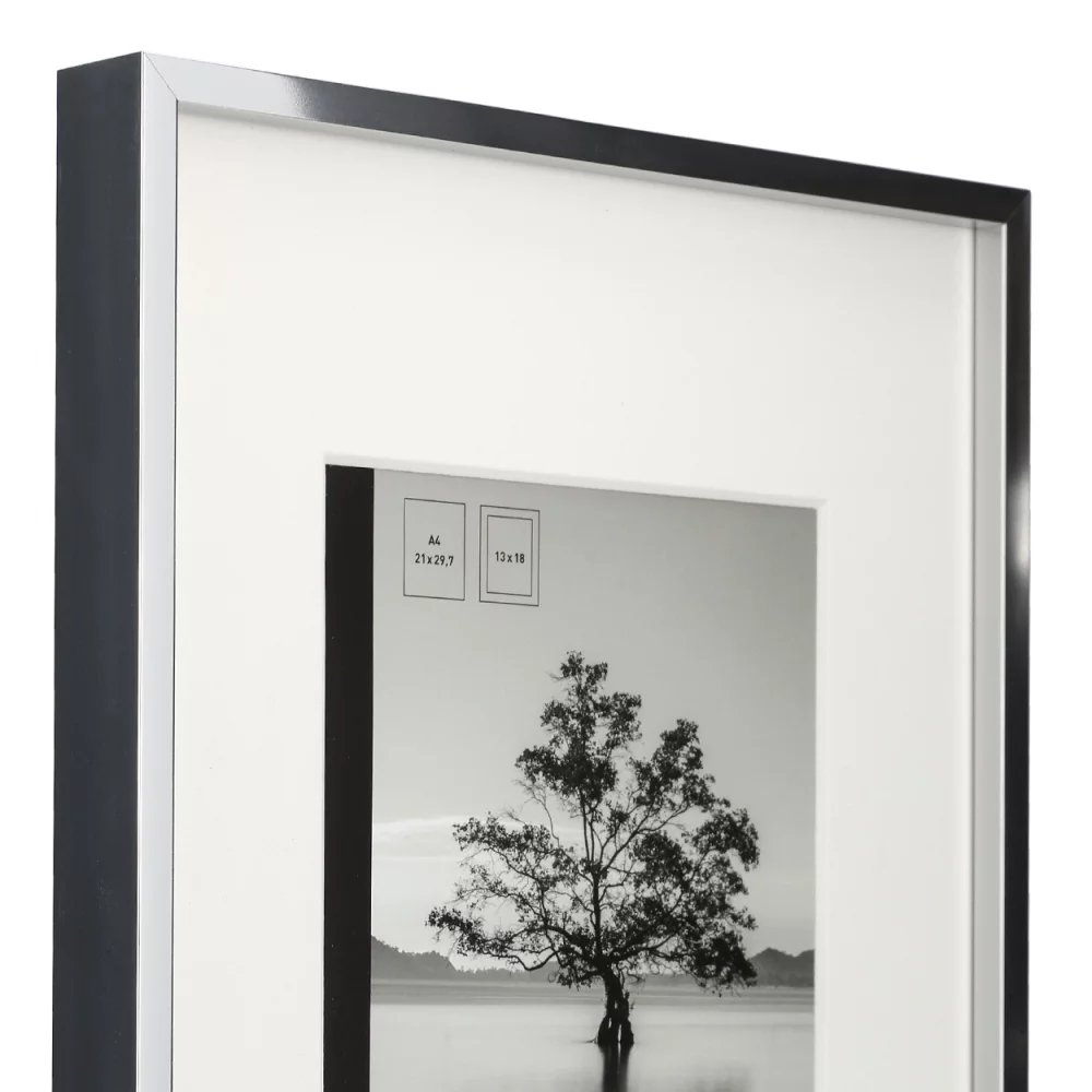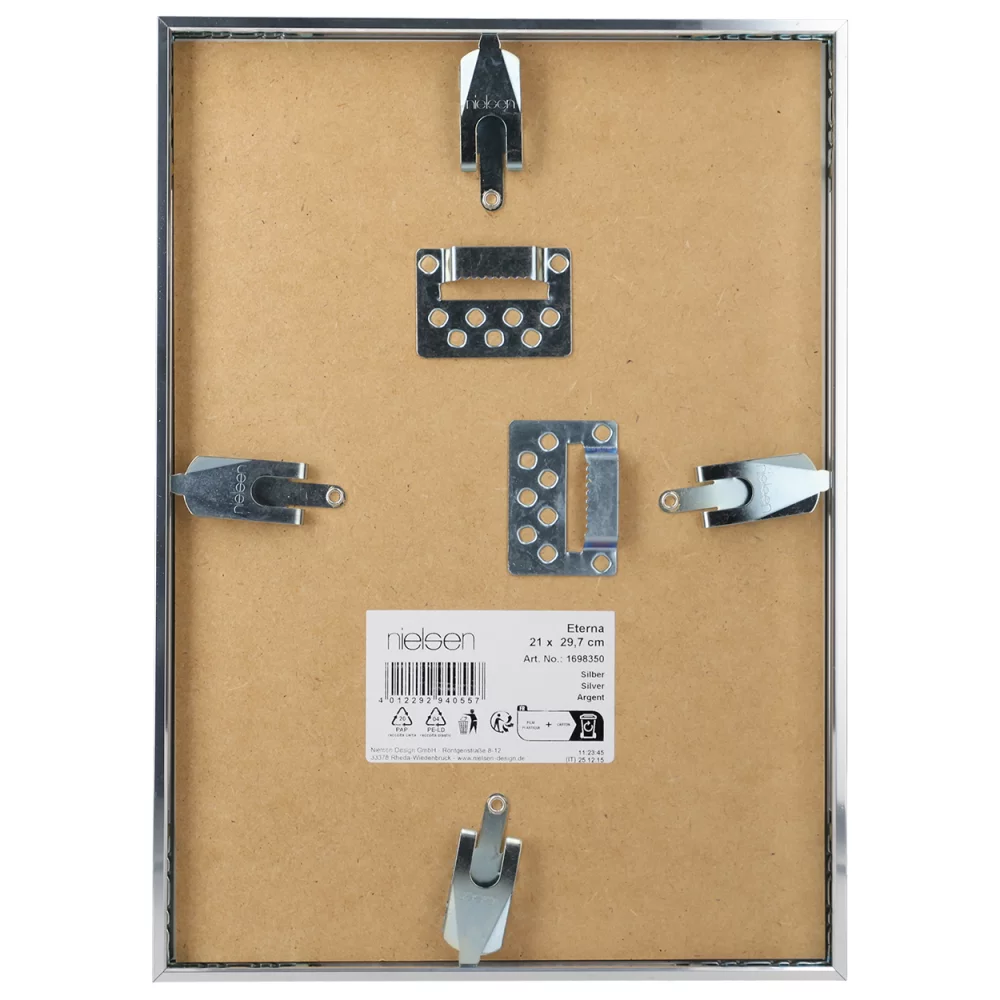 Erhältlich in mattem Schwarz oder glänzendem Silber, fügt sich „Eterna“ nahtlos in moderne Wohneinrichtungen ein. Die exakt gearbeiteten Gehrungsecken unterstreichen die hohe Verarbeitungsqualität und sorgen für ein perfektes Gesamtbild. Die Einlegehöhe des Rahmens beträgt 6 mm, damit eignet er sich auch für die Einrahmung tieferer Bilder, flacher Objekte wie zum Beispiel gepresste Pflanzen oder für Collagen.