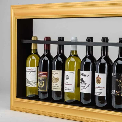 Die Konstruktion besteht aus einer Tragfläche, auf der die einzelnen Flaschen positioniert werden, aus einer Halterung mit runden Öffnung durch die die Flaschenhälse eingeführt werden können und dadurch einen festen Halt bekommen. Die Rückseite des Regals ist offen und liegt direkt an der Wand auf. Die Vorderseite ist ebenfalls offen und wird ohne Glas geliefert. Die Bilderrahmen sind in zwei Ausführungen im horizontalen und vertikalen Format erhältlich und bieten Platz für jeweils bis zu 12 Weinflaschen. Der Bilderrahmen besteht aus Kunststoff und ist somit äußerst stabil, um die Weinflaschen sicher tragen zu können aber gleichzeitig relativ leicht, was das Aufhängen wesentlich erleichtert.