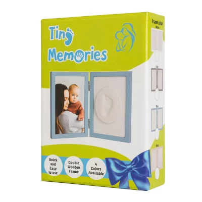 Mit dem Set Tiny Memories Frames mit Ton können Sie auch mit ganz kleinen Kindern sehr schnell und einfach einen Erinnerungsabdruck, z.B. von einer Hand, anfertigen. Unser Produkt ist ein Doppelrahmen, handgefertigt nur aus Naturholz in einer von 4 Farben zur Auswahl. Weiß, Graublau und Rosa. Ebenfalls enthalten ist ein extrem weicher und verformbarer Ton. Es ist sehr weich und formbar, so dass auch die kleinsten Kleinkinder zusammen mit ihren Eltern einen Riesenspaß beim Anfertigen eines Erinnerungsaufdrucks haben. Ein großer Vorteil unseres Tons ist auch die Tatsache, dass er nicht gebrannt werden muss. Es wird so zubereitet, dass es an der Luft automatisch trocknet.