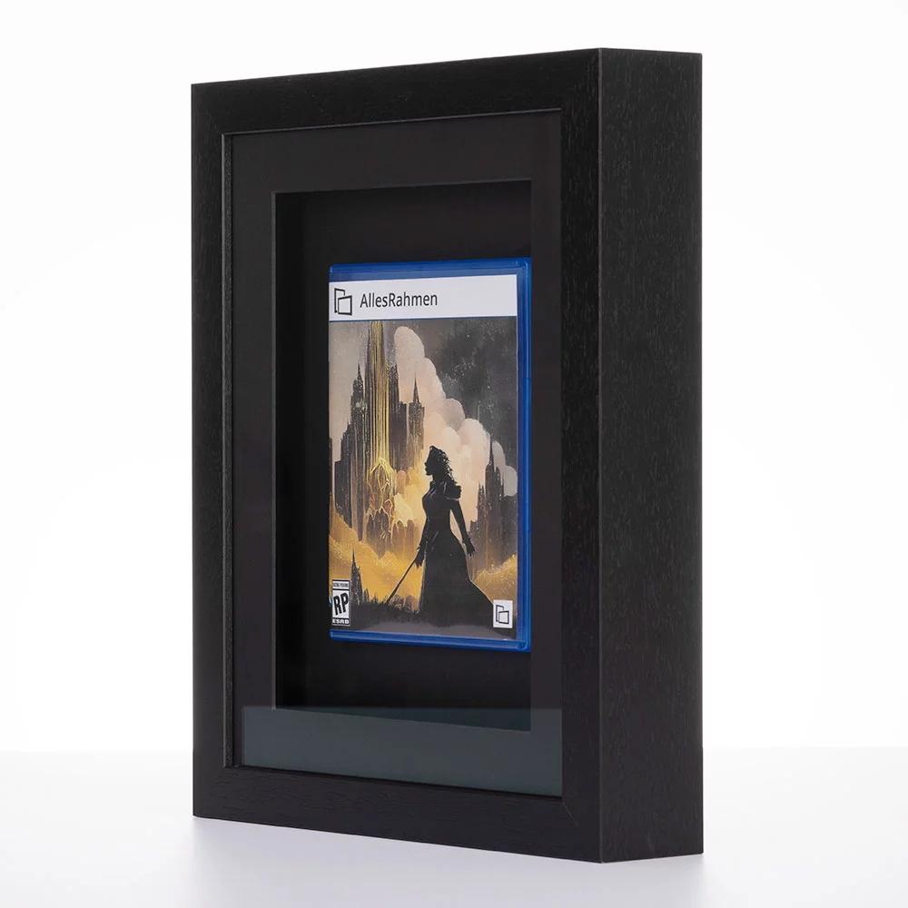 Unser hochwertiger GameFrame-Objektrahmen Hero verwandelt deine Lieblingsspiele und alle weiteren passenden Hüllen in ein einzigartiges Deko-Highlight für dein Zuhause. Jede Hülle wird sicher in eine hochwertige Leichtschaumplatte eingebettet und in einen massiven Holzrahmen mit Distanzleiste eingerahmt.