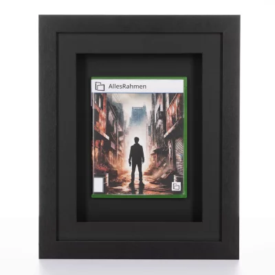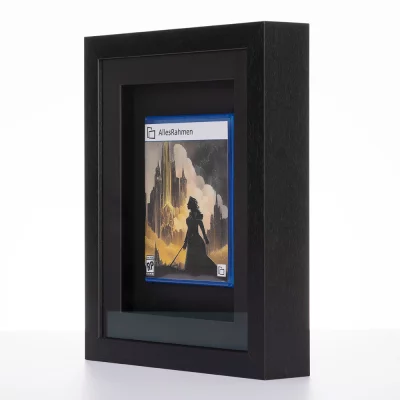 Die integrierte Distanzleiste ist fertig montiert und passend zur Farbe des GameFrames Hero in Schwarz geliefert. Durch die breite Distanzleiste entsteht eine beeindruckende Tiefenwirkung, die deine Spielehüllen perfekt in den Fokus rückt. Diese Tiefenwirkung wird in der Kombination mit einem schwarzen BlackCore-Passepartout nochmal verstärkt.