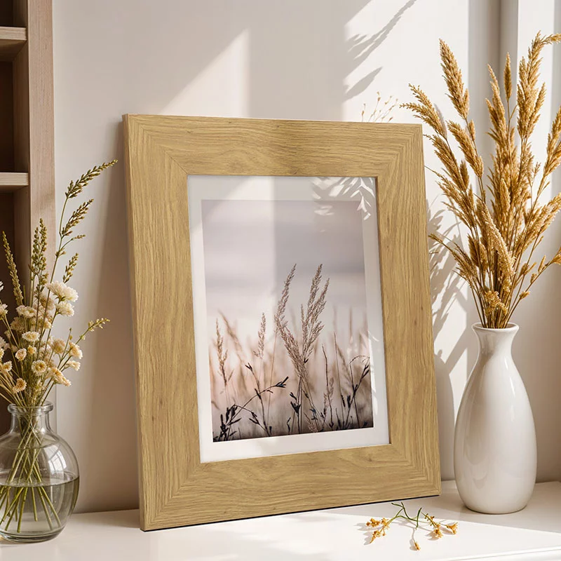 Das Ambio 2er-Set umfasst zwei Holzrahmen aus MDF in Eichenoptik, die durch ihr breites, flaches Profil mit feiner Holzstruktur überzeugen. Ihr klares, modernes Design macht sie zu einer passenden Wahl für Fotos, Kunstdrucke oder Zertifikate ab DIN A4-Größe oder größer.
