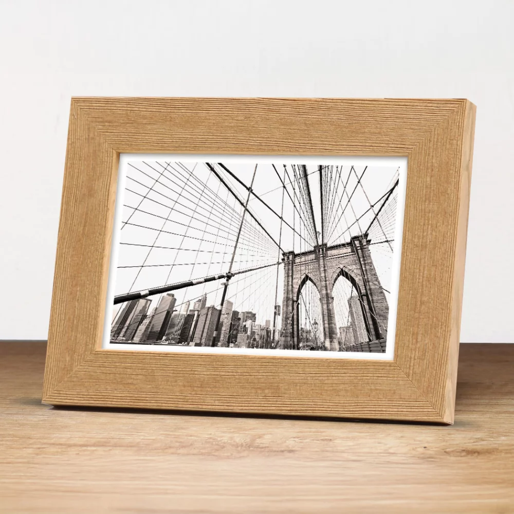 Der Solvane Holz-Bilderrahmen zeichnet sich durch ein breites, kantiges Profil aus Holz in Eiche aus. Auf der Rückwand befinden sich Aufhänger zu beiden Seiten, die es ermöglichen, den Rahmen sowohl im Quer- als auch im Hochformat zu nutzen. Die Rückwand ist mit Flexpins ausgestattet, die das einfache Öffnen und sichere Verschließen des Rahmens ermöglichen. Dank seines Profils verleiht der Rahmen Ihren Bildern einen ausdrucksstarken Look.