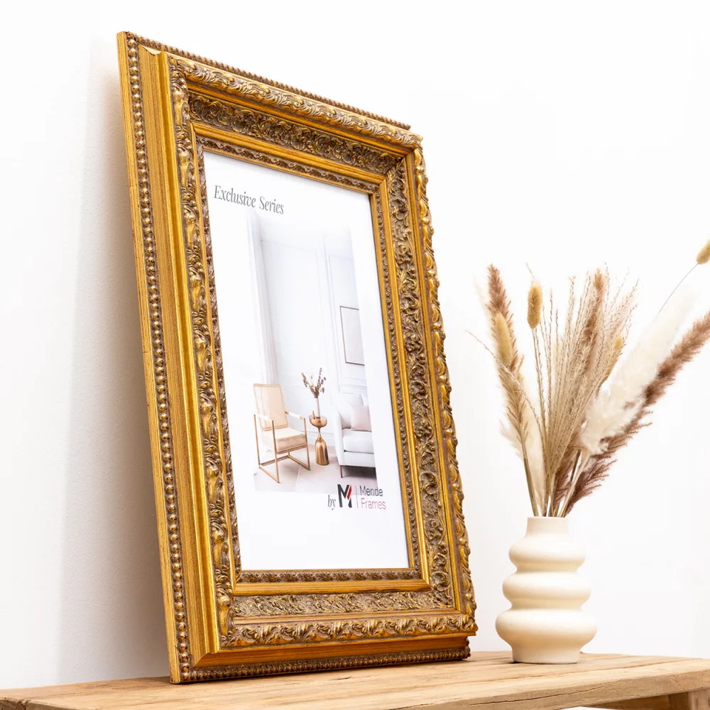 Die Rahmenprofile der Serie exclusiv zeichnen sich durch prachtvolle barocke und antike Stilelemente aus und besitzen eine detailreiche Ornamentierung. Die sorgfältige Oberflächenveredelungen machen diese exklusiven Rahmen zu einem besonderen Blickfang an Ihrer Wand. Kunden, die ein Auge für schöne Details haben, werden sich in diese luxuriösen Massivholzrahmen verlieben.