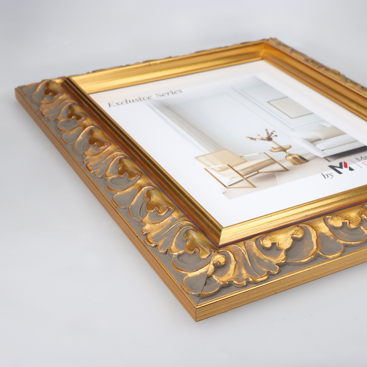 Die Rahmenprofile der Serie exclusiv zeichnen sich durch prachtvolle barocke und moderne Stilelemente aus und besitzen eine detailreiche Ornamentierungen. Die sorgfältige Oberflächenveredelungen machen diese Exklusiv Rahmen zu einem besonderen Blickfang an Ihrer Wand. Kunden, die ein Auge für schöne Details haben, werden sich in diese luxuriösen Massivholzrahmen verlieben.