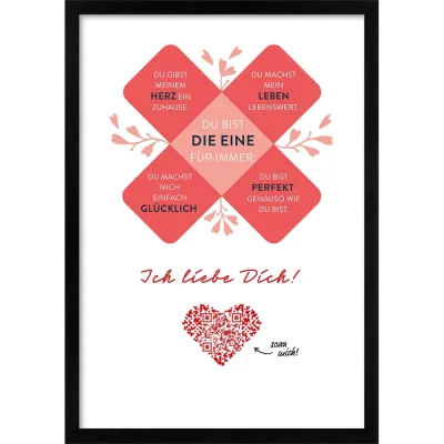 Am Ende deiner Danksagung befindet sich ein einmaliger QR-Code in dem großen roten Herz versteckt. Dein Lieblingsmensch kann diesen Code jederzeit mit seinem Smartphone scannen und empfängt dann seine persönliche und individuelle Botschaft. Möglich sind 15 Sekunden Audio- und Sprachnachrichten, kurze Videos oder Fotogalerien mit max. 15 Bildern.