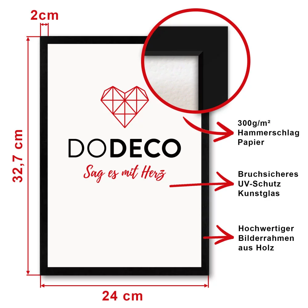 Für unsere mit Liebe gestalteten Bilder wird hochweißes, FSC-zertifiziertes, 300g/m² Hammerschlag-Papier verwendet. Die Hammerschlagprägung verleiht dem Papier eine edle Anmutung und hebt sich deutlich von normalen Kunstdrucken ab, ohne aufdringlich zu wirken. Die Bilder haben das Format 21x29,7 cm DIN A4, dass sowohl an der Wand als auch auf dem Tisch eine gute Figur macht. Die Bilder werden mittels eines professionellen 12-Farben Pigmentfarbdruckers in einer Manufaktur in Berlin gedruckt und direkt eingerahmt. Dank des hochwertigen Drucks haben die Bilder eine sehr starke Farbkraft, sowie eine hohe Lichtechtheit und Wasserfestigkeit.