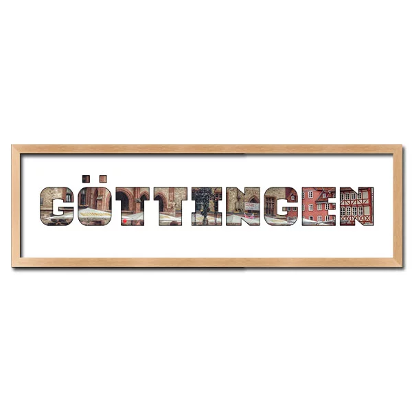 Wählen Sie aus zahlreichen deutschen Städten, Inseln, Gewässern oder Bundesländern. Die ausgeschnittenen Buchstaben im Passepartout lassen sich mit einem Panoramafoto oder mehreren einzelnen Fotos hinterlegen. So entsteht eine ganz persönliche Collage, die Ihr Zuhause schmückt oder sich perfekt als Geschenk eignet.