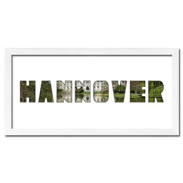 Wählen Sie aus zahlreichen deutschen Städten, Inseln, Gewässern oder Bundesländern. Die ausgeschnittenen Buchstaben im Passepartout lassen sich mit einem Panoramafoto oder mehreren einzelnen Fotos hinterlegen. So entsteht eine ganz persönliche Collage, die Ihr Zuhause schmückt oder sich perfekt als Geschenk eignet.