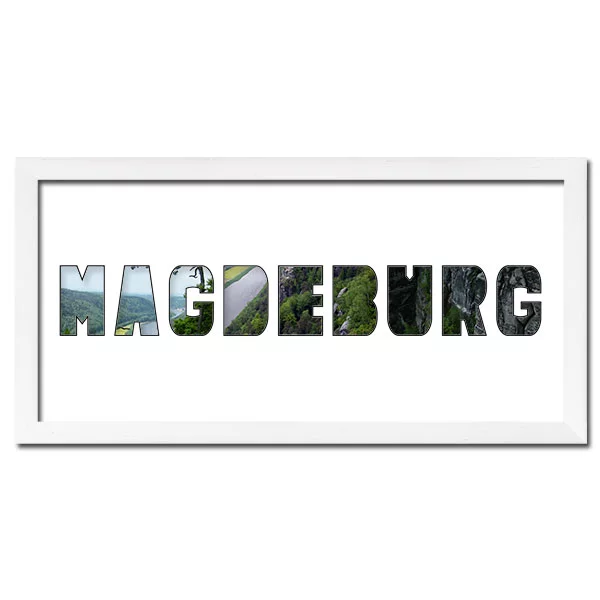 Wählen Sie aus zahlreichen deutschen Städten, Inseln, Gewässern oder Bundesländern. Die ausgeschnittenen Buchstaben im Passepartout lassen sich mit einem Panoramafoto oder mehreren einzelnen Fotos hinterlegen. So entsteht eine ganz persönliche Collage, die Ihr Zuhause schmückt oder sich perfekt als Geschenk eignet.