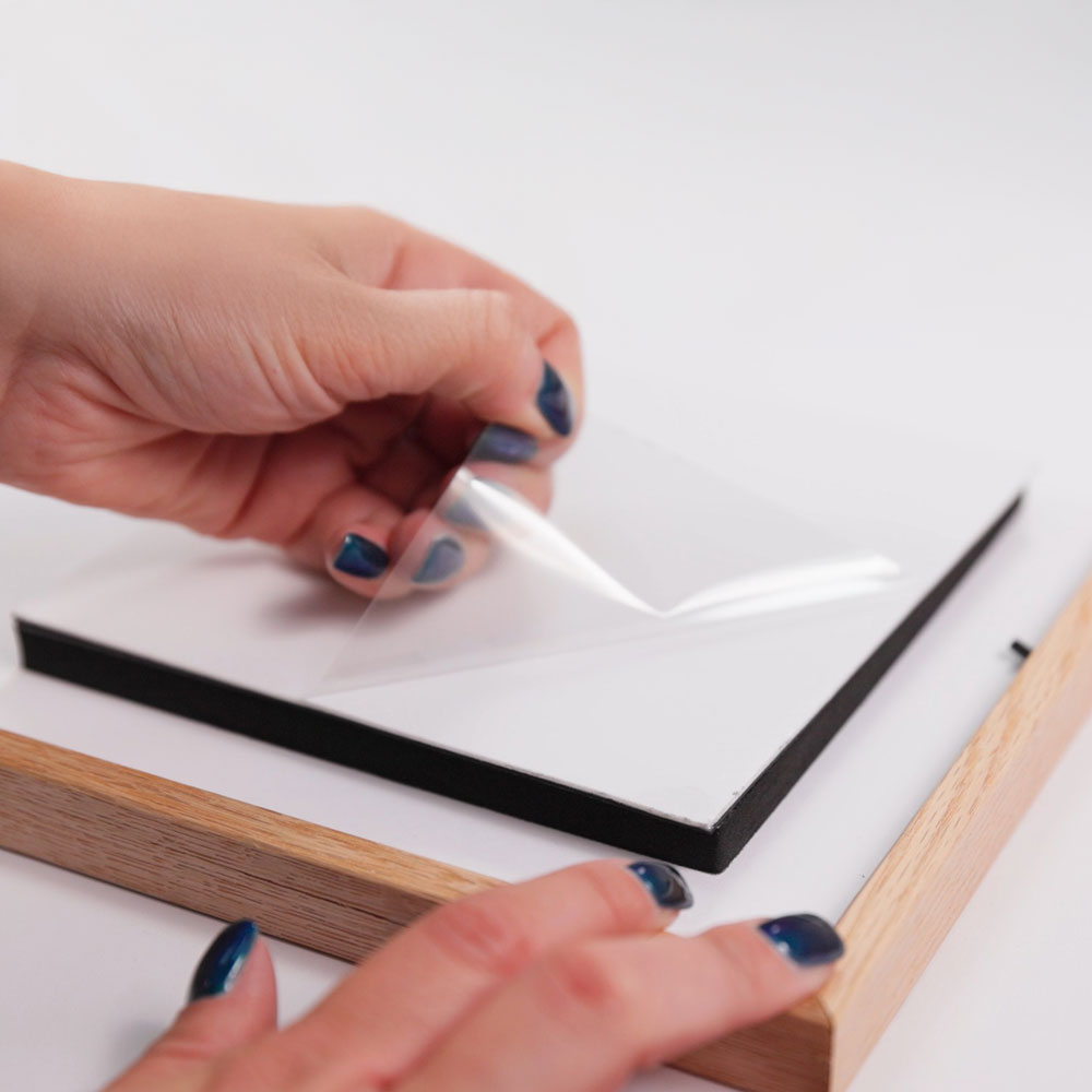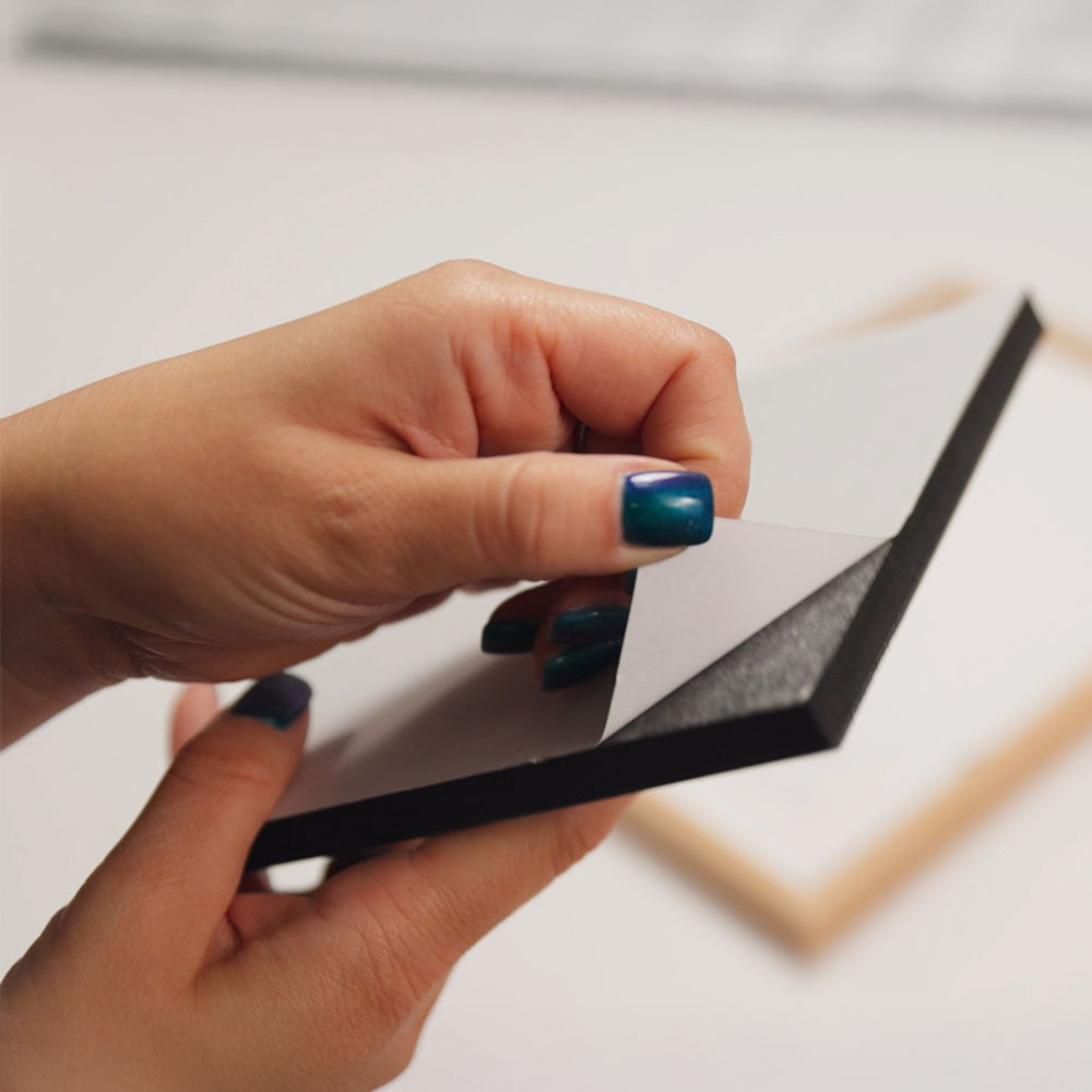 - Ziehen Sie die transparente Schutzfolie von der stärkeren Magnetseite des Pads ab und kleben Sie es auf die Rückseite des Rahmens – mittig oder bei großen Formaten (ab 60 × 90 cm) jeweils in die oberen Ecken.