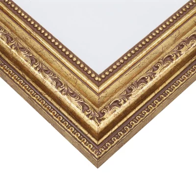 Die aufgebrachte Dekorfolie mit leichter Patinierung und zart angedeuteter Alterung erzeugt den Look eines klassischen Vintage-Barockrahmens.