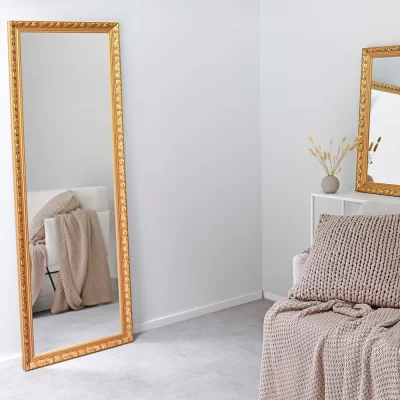 Das Format 50x150 cm bezieht sich auf die Größe der Spiegelglasscheibe. Das Außenformat des Barockspiegels Francesca beträgt 60,5x160,5 cm, die Höhe des Holzprofils 3,3 cm. Das 3 mm dicke Spiegelglas ist kupferfrei, hoch korrosionsbeständig und aus silberbeschichtetem Floatglas für den Innenbereich hergestellt (nach DIN EN 1036). Der Spiegel wird für optimale Stabilität rückseitig in den Holzrahmen eingeklebt und kann nicht entnommen werden.